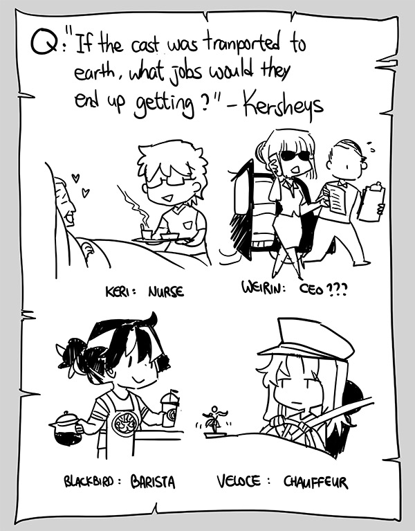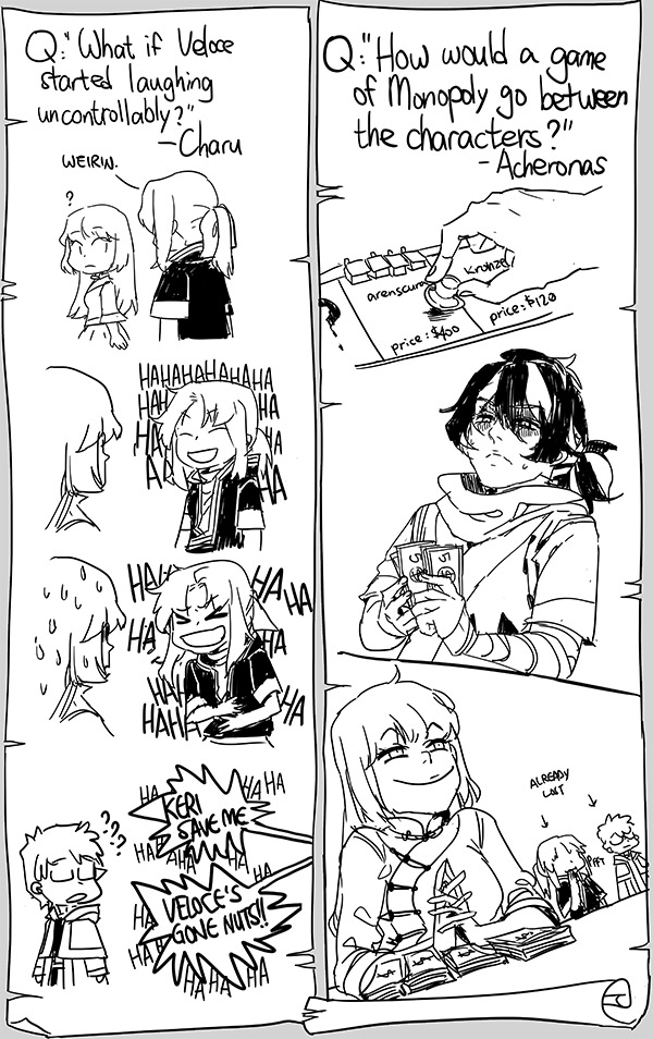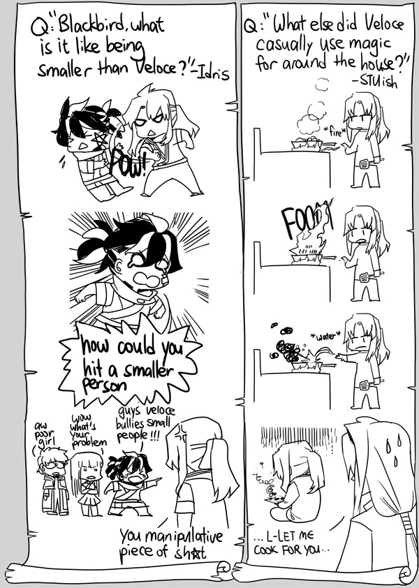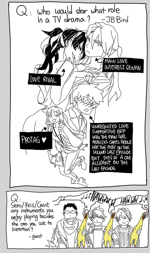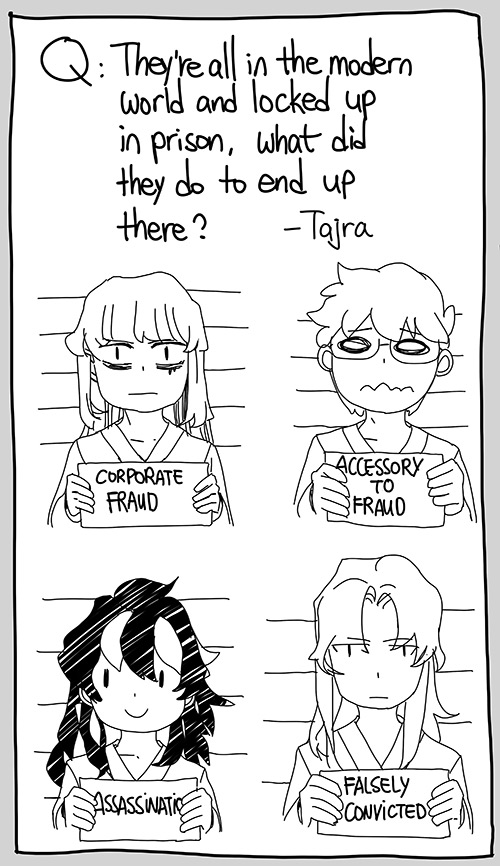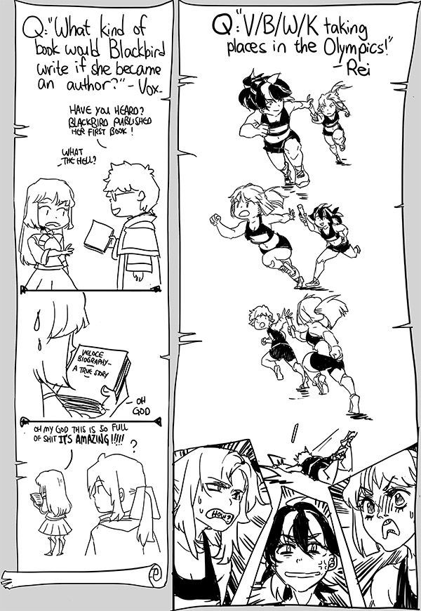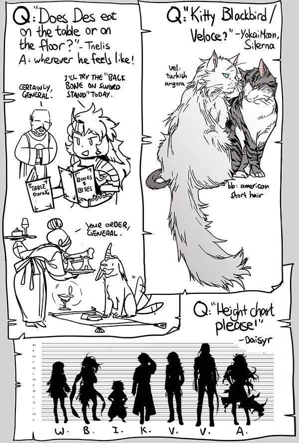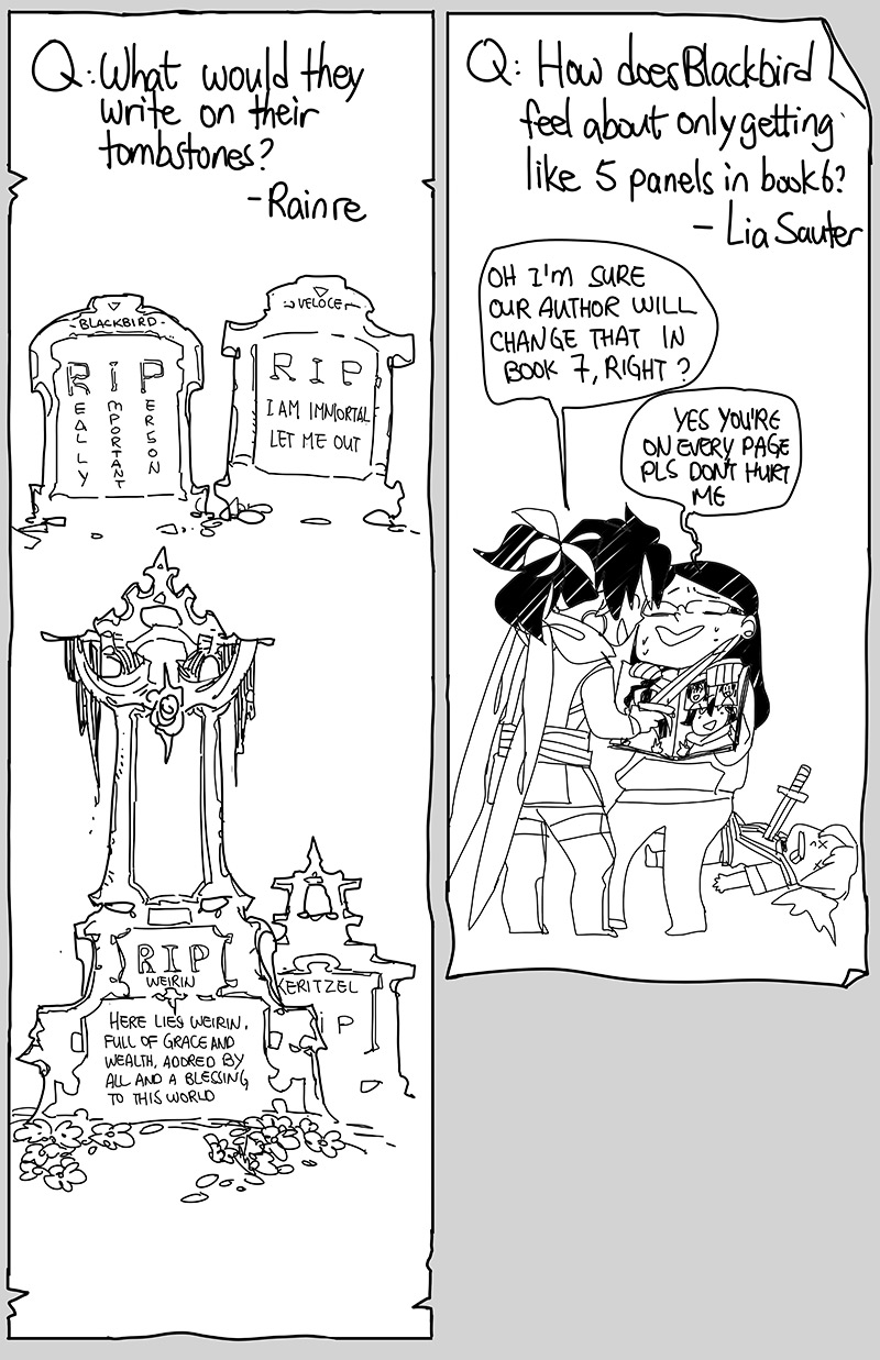 A few months worth of character Q&A fun comics that I did in between the publication of books 5 and the start of book 6 as I did storyboards, then again between 6 and 7! More to come in the future between volumes :D These contain SPOILERS if you aren't up to date with the current story, be warned!